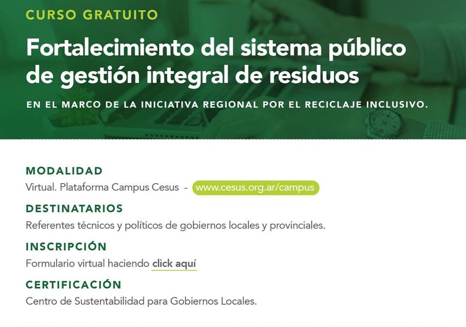 En el marco de la Iniciativa Regional por el Reciclaje Inclusivo (IRR), el próximo lunes 1º de abril el Centro de Sustentabilidad – CeSus dará inicio a la capacitación virtual «Fortalecimiento del sistema público de Gestión Integral de Residuos (GIRSU)».