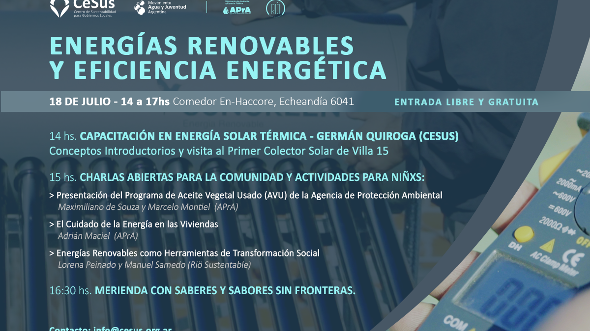 El encuentro, desarrollado en conjunto con el Movimiento Agua y Juventud Argentina, se enmarca en un proyecto integral de transición a la sustentabilidad de un espacio comunitario barrial, al que asisten diariamente más de 300 niños, niñas y adultos. Entre las acciones concretas desarrolladas por CeSus para contribuir en dicha transformación, se destaca la reciente instalación de un equipo termosifónico en el Comedor En-Haccore. La promoción de la incorporación de energías renovables y medidas de eficiencia energética en barrios vulnerables constituye una estrategia para fomentar el consumo consciente y responsable de la energía. La adopción de dichos cambios implica un consecuente ahorro energético y económico. Asimismo, la capacitación en la instalación y mantenimiento de tecnologías sustentables de aprovisionamiento y ahorro energético conlleva a una apertura en las posibilidades de inserción laboral de los vecinos.